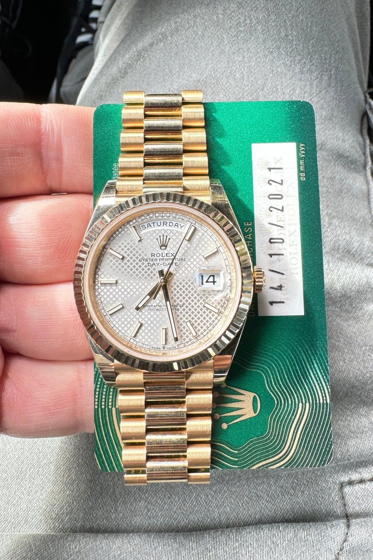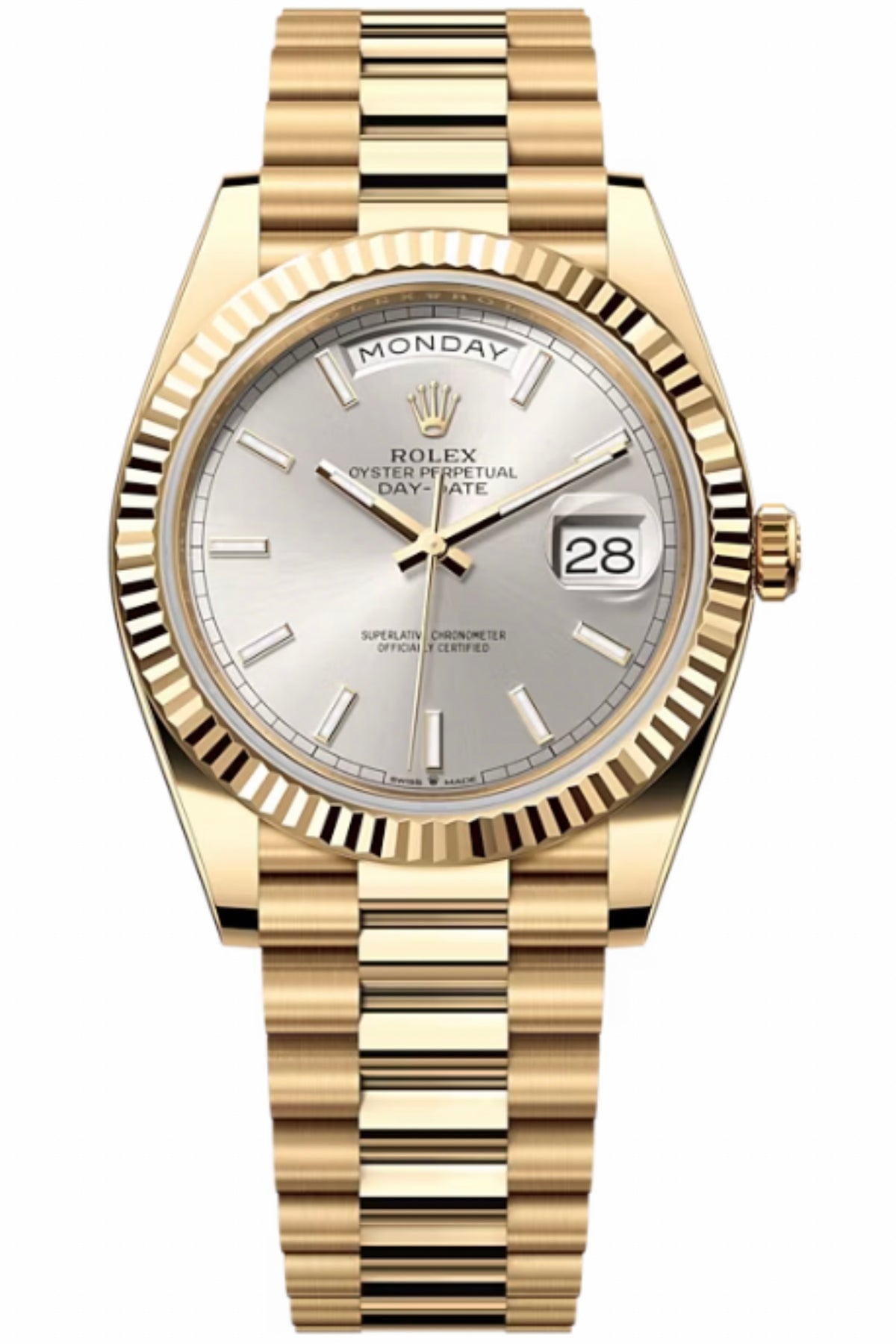 The Oyster Perpetual Day-Date 40 in 18 kt yellow gold with a silver dial, flutedbezel and a Presidentbracelet.