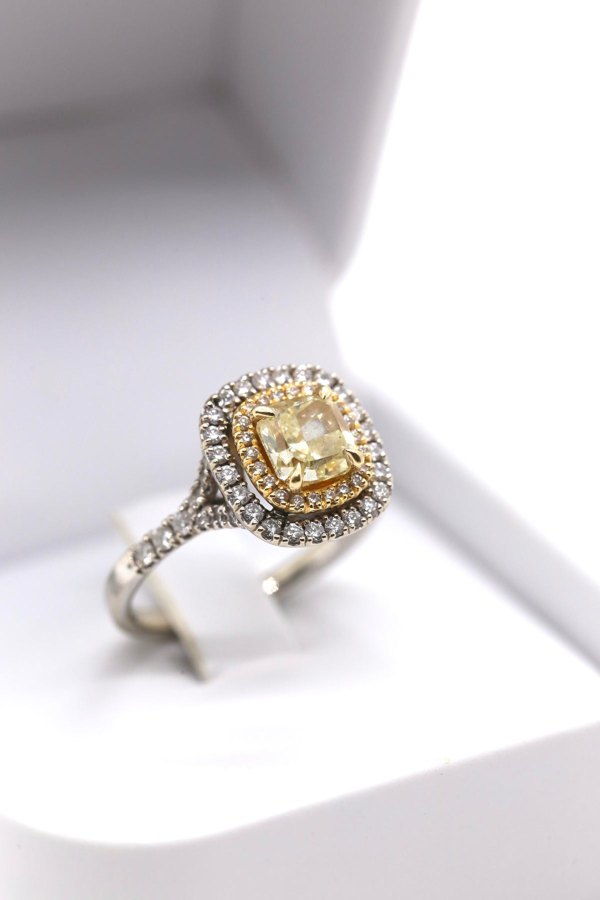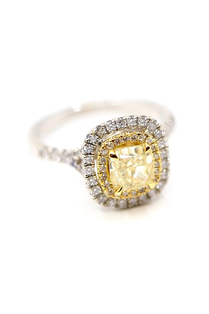 2.16 Carat Cushion Diamonds and Gold Double Halo Engagement Ring